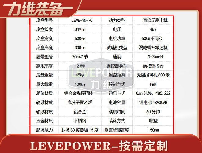 橡膠履帶底盤(pán)長(zhǎng)849mm,履帶底盤(pán)寬600mm,履帶底盤(pán)高338mm,無(wú)線遙控履帶底盤(pán)搭載48V500W直流永磁無(wú)刷電機(jī),RV渦輪蝸桿減速機(jī)動(dòng)力更強(qiáng),爬坡更有勁。