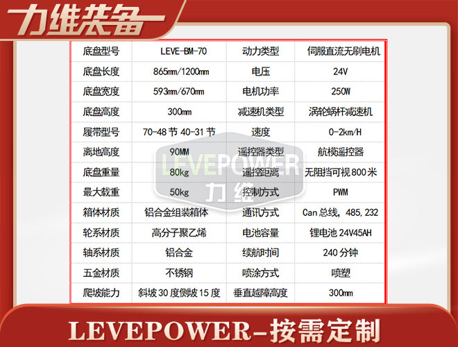 該底盤主體履帶使用100mm寬耐磨橡膠履帶,外花紋橫紋設(shè)計(jì),提高攀爬能力。擺臂履帶采用40mm寬度機(jī)器人橡膠履帶,底盤箱體經(jīng)過高溫噴砂噴塑防銹處理,主題底盤采用2個24v200w伺服直流無刷電機(jī),擺臂采用1個24v200w伺服直流無刷電機(jī),渦輪蝸桿減速機(jī),可載重50kg,是一種操控既方便,有實(shí)用的底盤系統(tǒng),在不平坦的路面,爬坡,越障非常好用。是一款全地形底盤。電池采用24v45ah磷酸鐵鋰鋰電池,持續(xù)續(xù)航時(shí)間可達(dá)4個小時(shí)長時(shí)間續(xù)航。